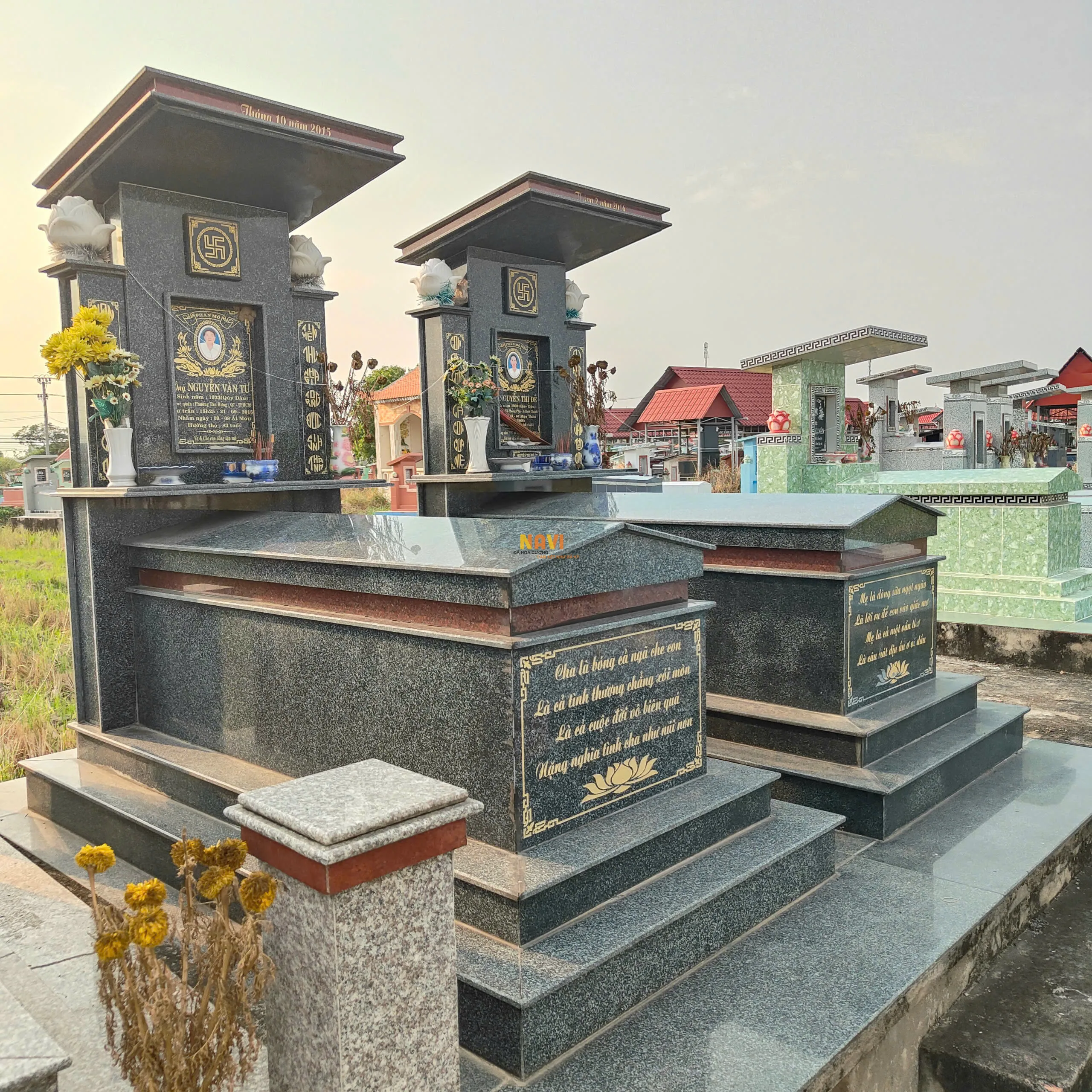 - Mộ bia đá hoa cương lớn với nhiều ngôi mộ nhỏ xung quanh, thể hiện sự gắn kết gia tộc.