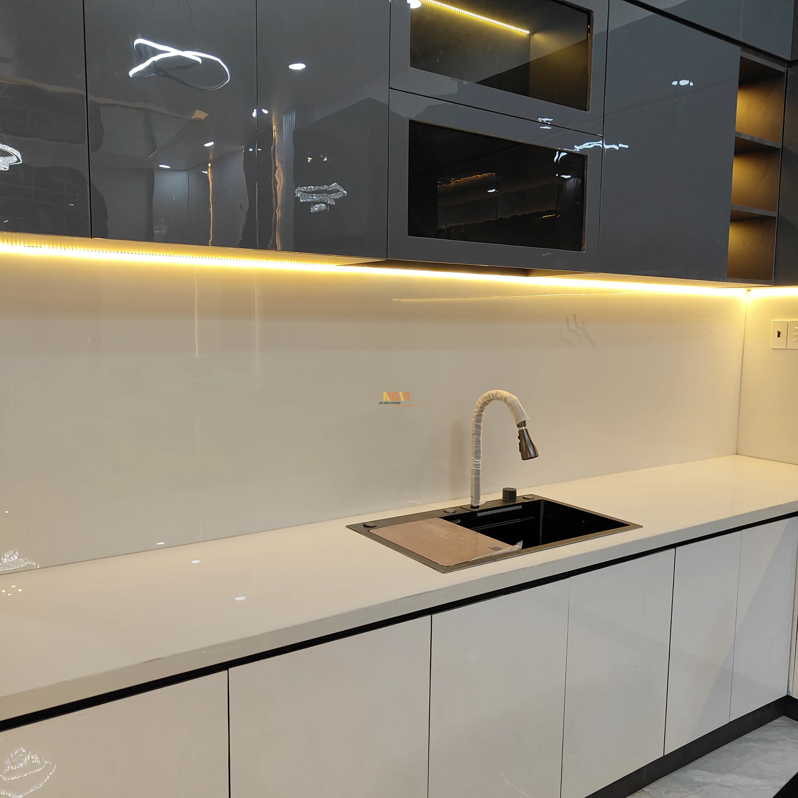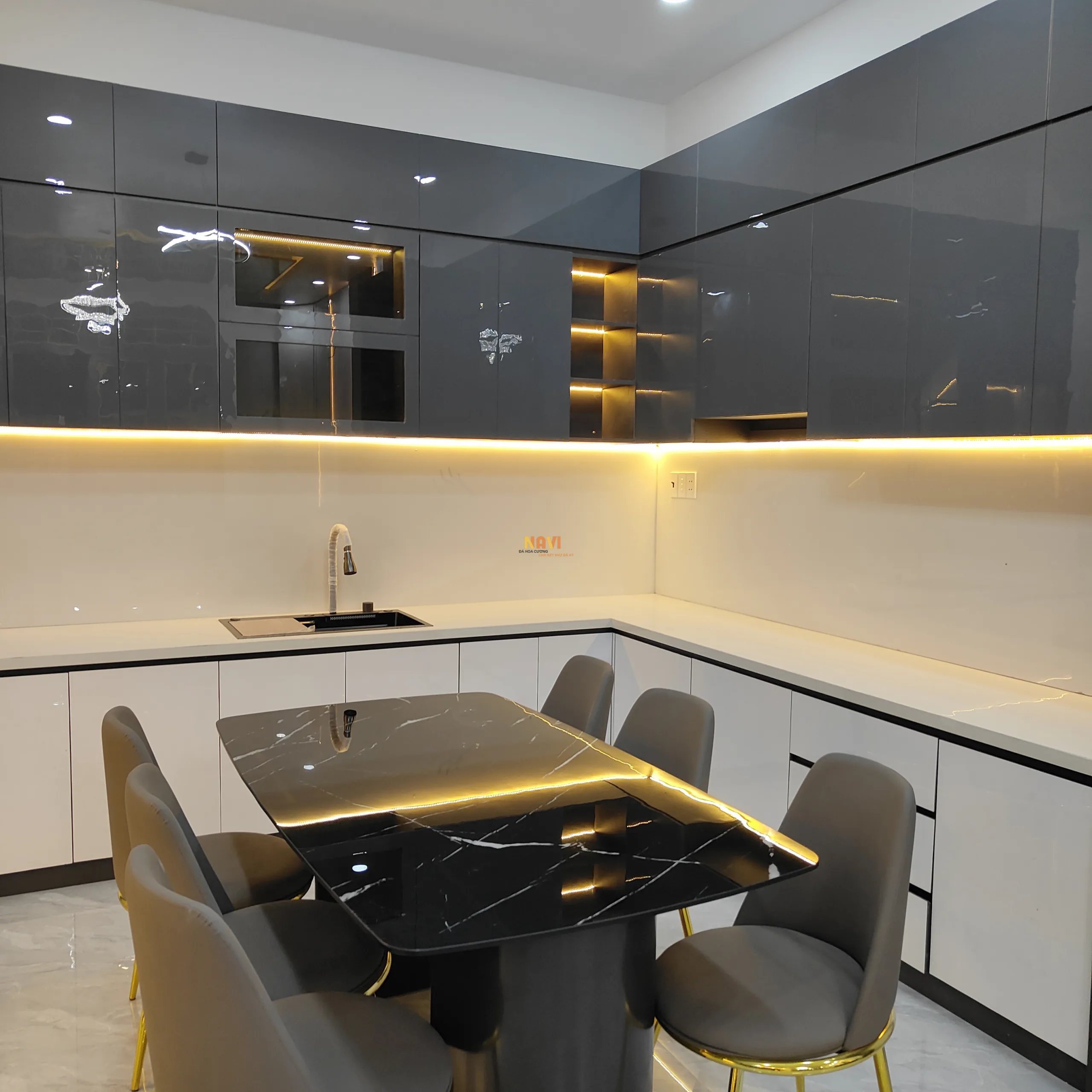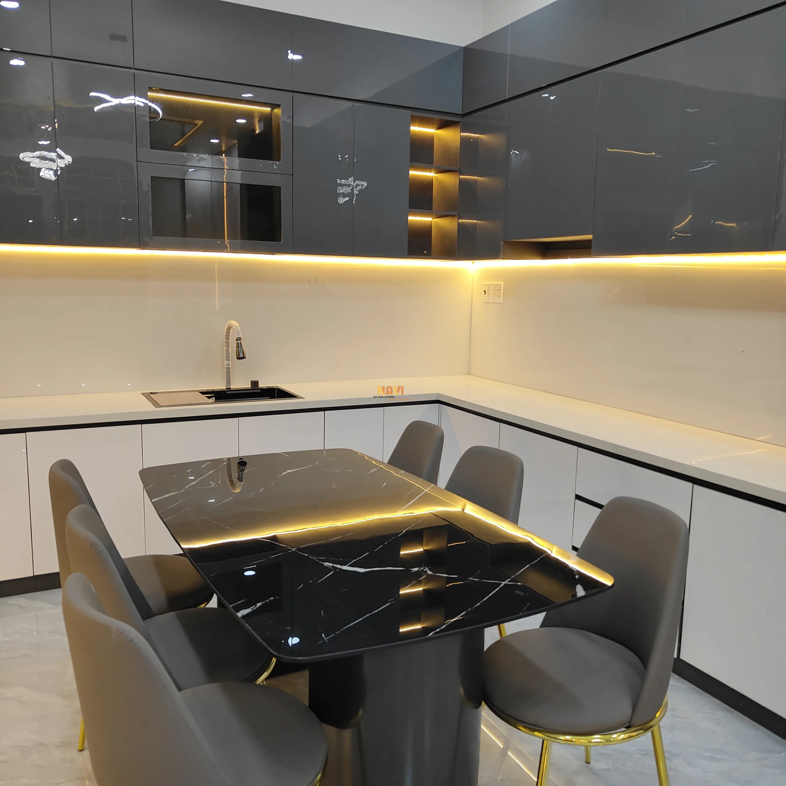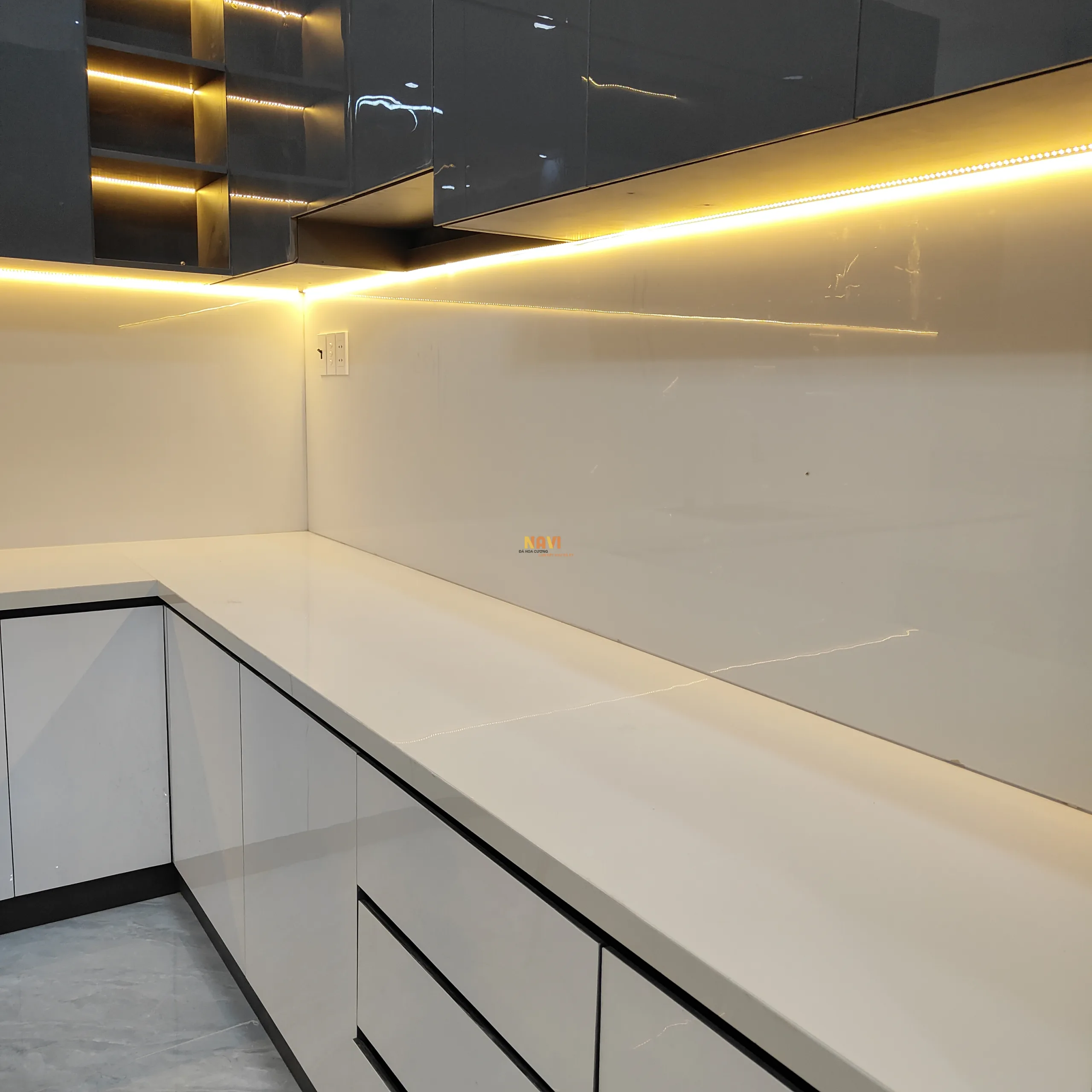Mẫu bếp full đá nung kết trắng lip 45 độ